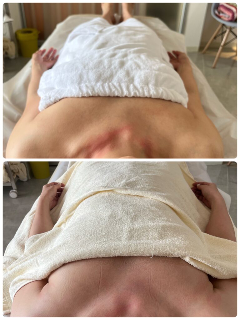 わき肉は右側はまっすぐすっきりし対照的に施術していない左側は二の腕にお肉が流れて左側全体に背中が大きく見えます。
