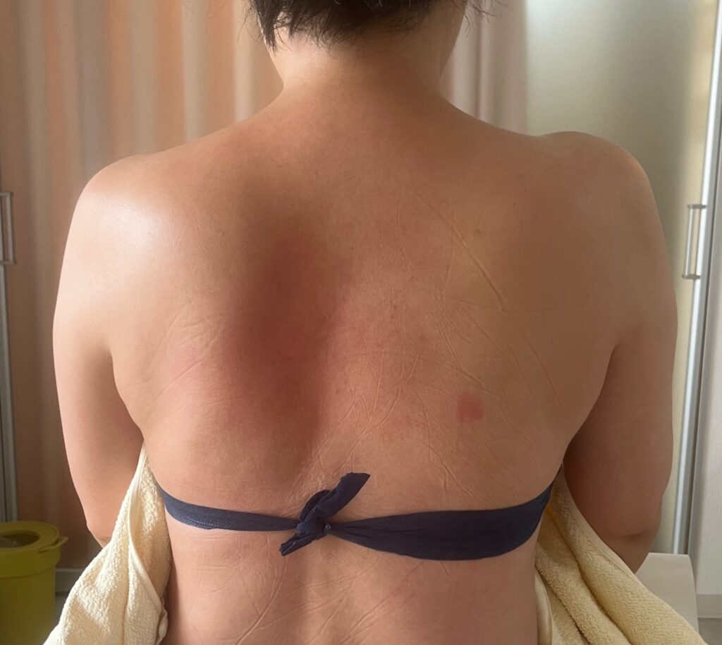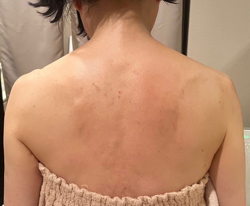(※上のお写真の鎖骨付近はインパクトを当てると温かくなるので赤みが出ていますが、施術後は流れて治まります。)